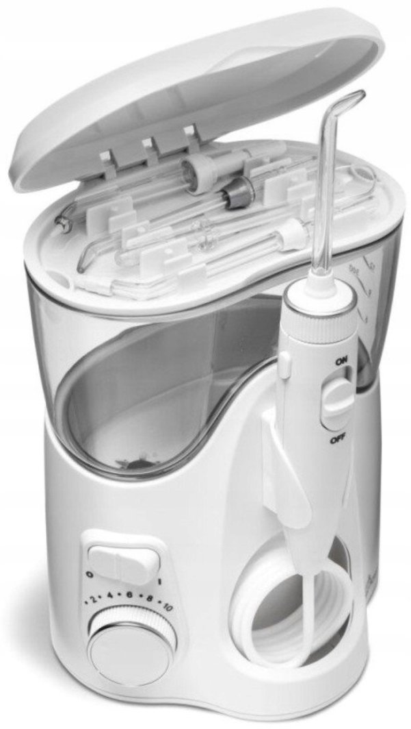 Wygodny uchwyt z wbudowanym włącznikiem/wyłącznikiem oraz zamykany zbiornik sprawiają, że korzystanie z irygatora jest niezwykle komfortowe. Dodatkowo, urządzenie posiada praktyczne schowki na końcówki, co zapewnia porządek i łatwy dostęp do akcesoriów.