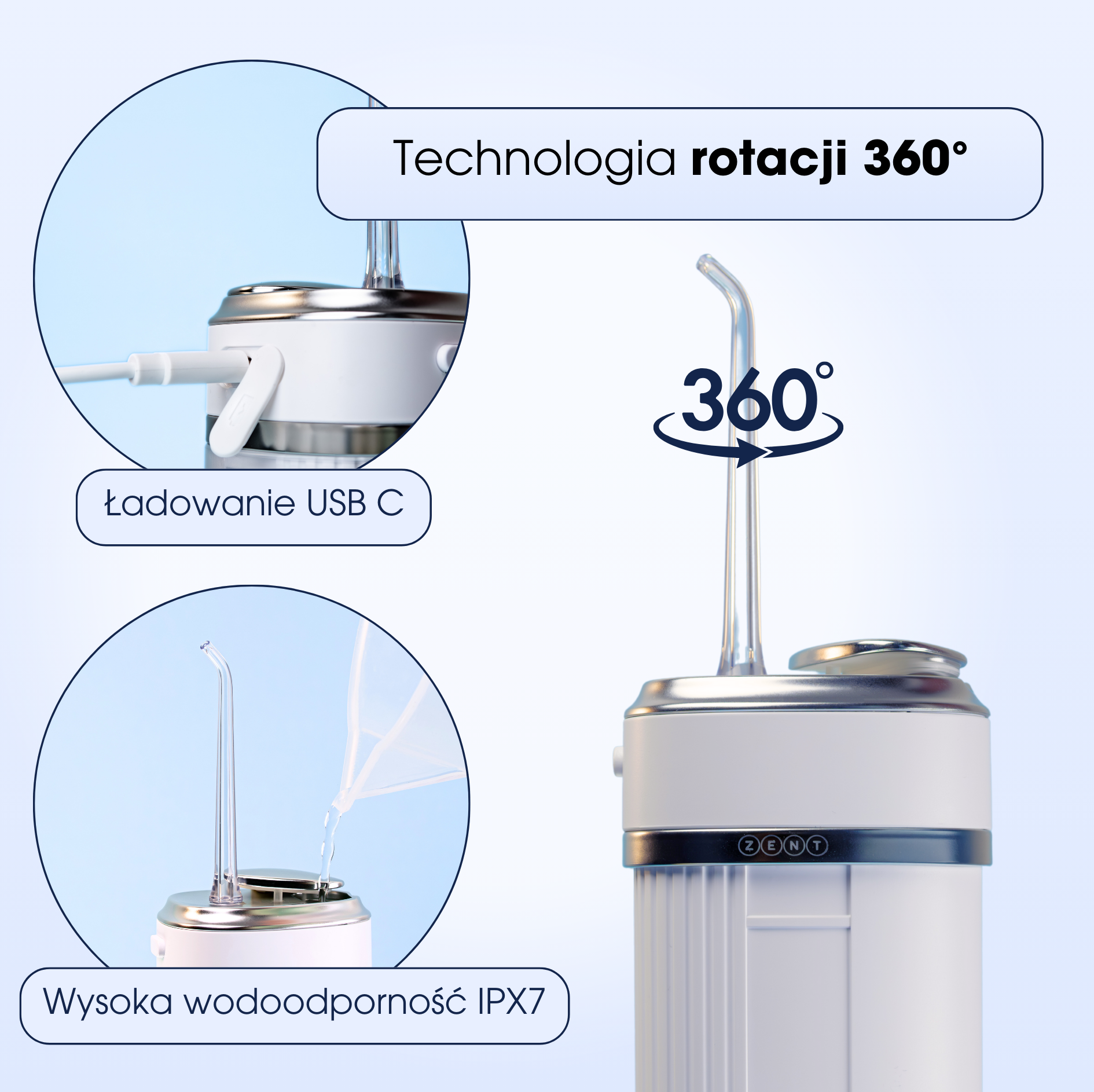 ZENT® Stream+ to innowacyjny irygator dentystyczny, który wykorzystuje zaawansowaną technologię obrotową 360° i pulsacyjny strumień wody, aby zapewnić kompleksową higienę jamy ustnej na poziomie niedostępnym dla tradycyjnych metod czyszczenia. Powstał dzięki inspiracji najnowszymi badaniami naukowymi, aby skutecznie eliminować płytkę nazębną, resztki pokarmowe i bakterie z trudno dostępnych miejsc.