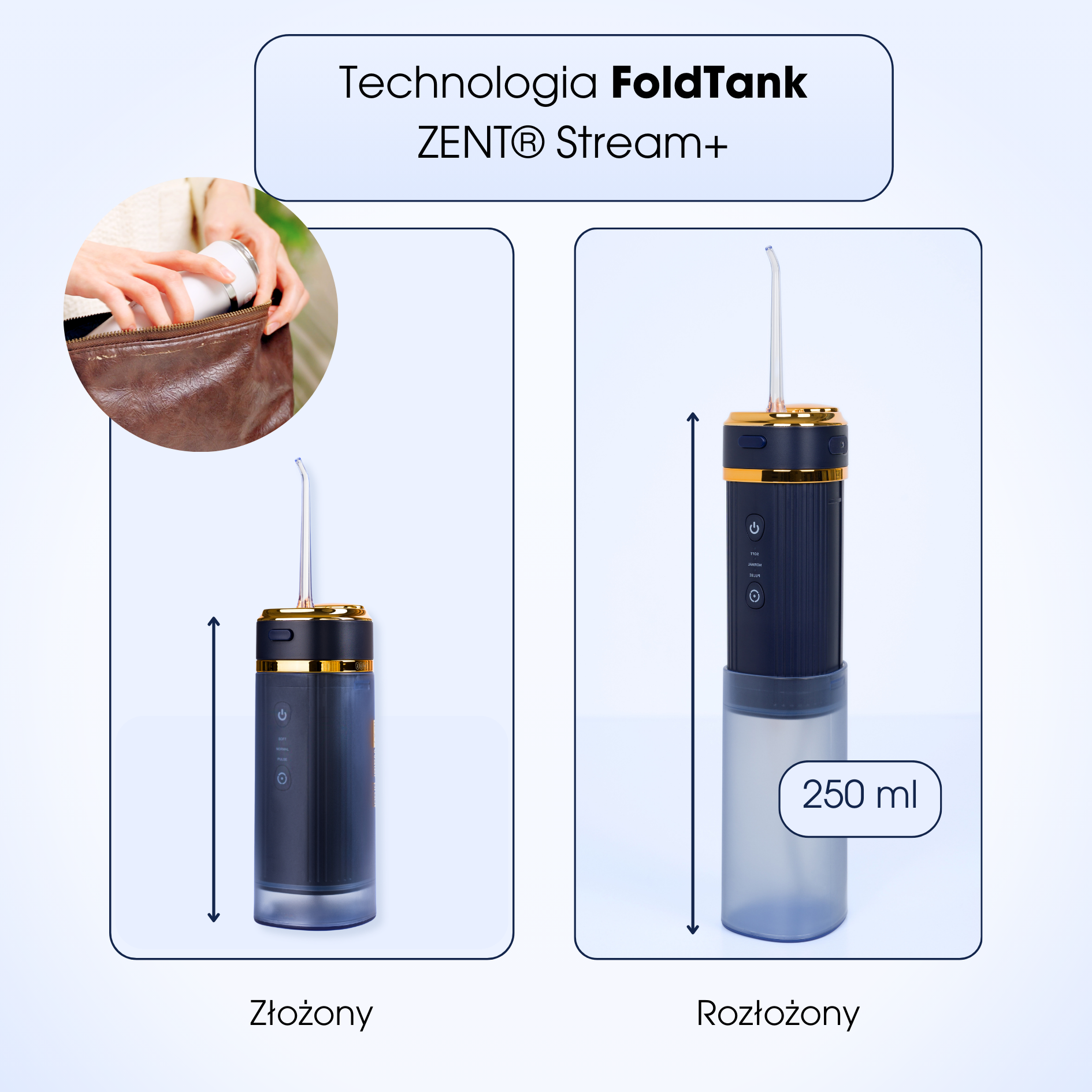 Lekka konstrukcja i pojemny składany zbiornik o pojemności 250 ml sprawiają, że ZENT® Stream+ doskonale sprawdza się w podróży. Kompaktowe wymiary pozwalają zmieścić urządzenie w kosmetyczce lub torbie podróżnej. Duża pojemność zbiornika na wodę pozwala na użytkowanie irygatora bez potrzeby częstego napełniania wodą!