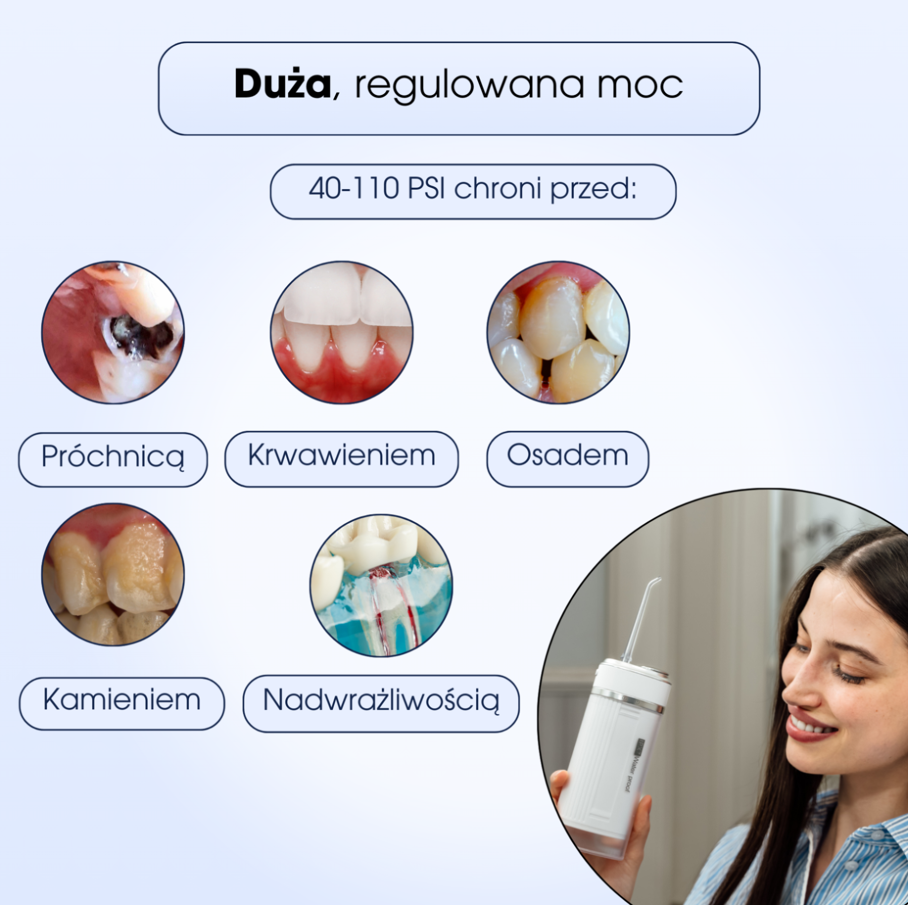 ZENT® Stream+ wykorzystuje unikalną technologię obrotową 360°, która pozwala na precyzyjne dotarcie do wszystkich zakamarków jamy ustnej. W połączeniu z regulowanym ciśnieniem wody (40-110 PSI) i intensywnymi pulsacjami (1500 ruchów na minutę), irygator skutecznie oczyszcza przestrzenie międzyzębowe, kieszonki dziąsłowe i okolice pod linią dziąseł - miejsca, gdzie tradycyjna nić dentystyczna często nie dociera.