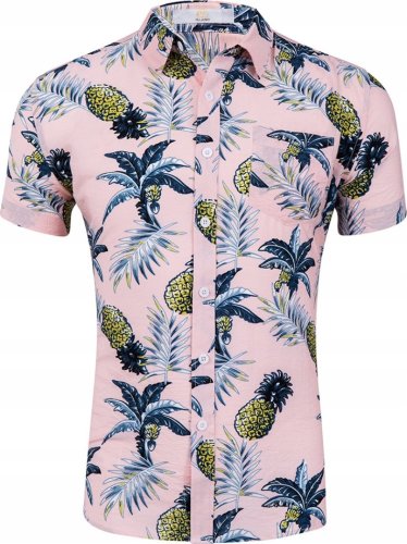 Koszula wyróżnia się pięknym, tropikalnym wzorem z zielonymi liśćmi i różowymi flamingami, które nadają jej unikalny, wakacyjny charakter. Idealna na letnie dni, imprezy na plaży, czy grillowanie w ogrodzie.