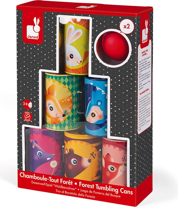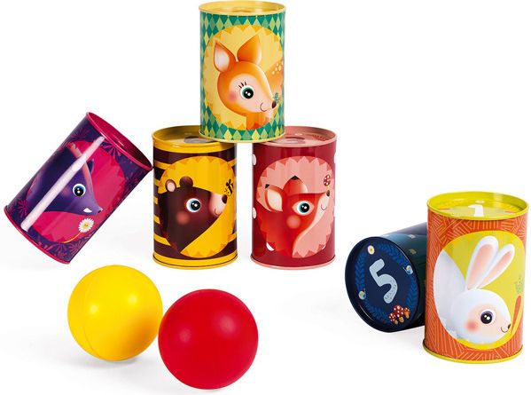 Gra w zbijanie metalowych puszek francuskiej marki JANOD to doskonała zabawa dla całej rodziny. Puszki są pięknie zdobione postaciami leśnych zwierząt (zająca, sarenki, jeża, dzika, liska i niedźwiedzia), układa się je w piramidę (wg schematu trzy-dwa-jeden), a następnie celuje w nie z większej odległości dołączonymi do zestawu piankowymi piłkami. Celem gry jest przewrócenie, tj. zbicie wszystkich puszek. To świetna gra zręcznościowa, idealna do zabaw plenerowych, np. na pikniki czy urodzinowe przyjęcia.