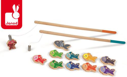 Gra zręcznościowa łowienie rybek francuskiej marki Janod to wspaniała zabawa dla dwójki dzieci lub dziecka i rodzica. Zestaw zawiera 10 drewnianych rybek w pięknych kolorach oraz jednego drewnianego rekina – 2 drewniane wędki zakończone są magnesem, za pomocą którego można łowić rybki. Gra ćwiczy koordynację ruchową, wspiera relację ręka-oko, uczy cierpliwości i skupienia.