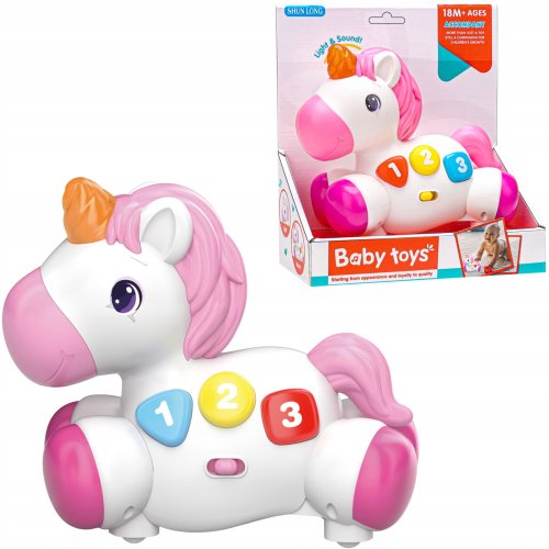 Jednorożec posiada trzy duże, kolorowe przyciski w kształcie trójkąta, koła i kwadratu. Te interaktywne elementy uczą dzieci pierwszych cyfr, kolorów oraz podstawowych kształtów poprzez zabawę. Dzięki temu maluchy mogą rozwijać swoje umiejętności w przyjemny sposób.
