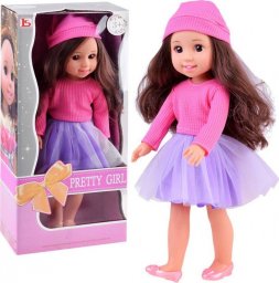 Urocza lalka dla każdej dziewczynki, zapewni mnóstwo pozytywnej zabawy. Laleczka o wzroście 36 cm ma długie brązowe, falowane włosy. Na głowie ma różową czapkę. Ubrana jest w różową bluzkę i fioletową spódniczkę, a na stopach różowe sandałki. Lalka w całości wykonana została z tworzywa sztucznego, dzięki czemu stabilnie siedzi. Posiada ruchome kończyny ręce i nogi. Długie, falowane włosy lalki można dowolnie upinać i czesać. Z taką modnisią można wyjść na bal lub popołudniową herbatkę.