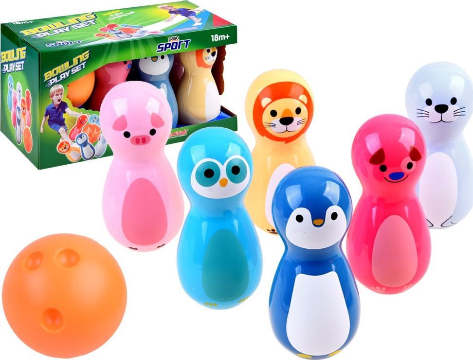 - 6 uroczych kręgli z wizerunkami (świnka, foka, pingwin, lew, piesek, sowa)