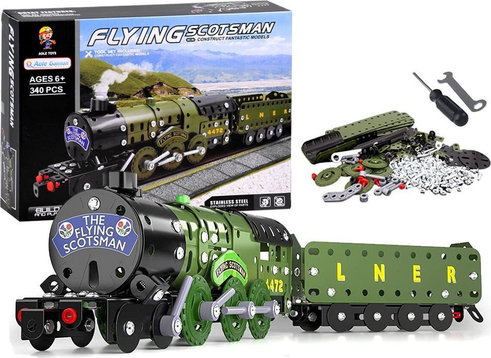 Zestaw konstrukcyjny pozwala na samodzielne zbudowanie sławnej lokomotywy "Flying Scotsman" wraz z wagonem. Zestaw idealny dla każdego fana małego inżyniera i konstruktora.