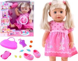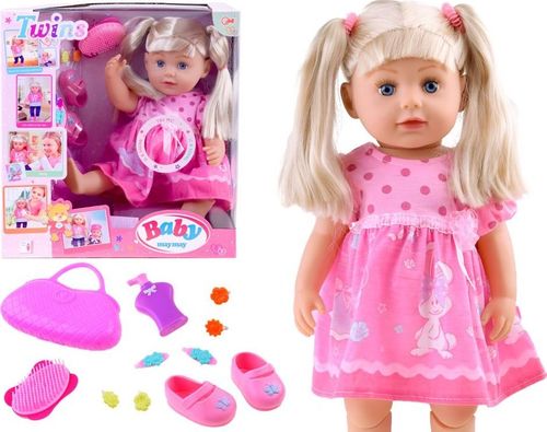 Urocza lalka bobas z kucykami sprawi wiele radości każdemu dziecku. Będzie świetną towarzyszką w każdej zabawie. Lalka ubrana w różową sukienkę, ma piękne niebieskie oczy oraz długie blond włosy zebrane w dwa kucyki. Posiada wbudowany w brzuszek głośniczek dzięki, któremu mówi "tata" oraz wydaje dźwięki podobne do śmiechu, gaworzenia oraz marudzenia. Jej atutem są ruchome kończyny co ułatwia przebieranie oraz opcja picia (lala robi siku). Zestaw zawiera spinki i gumki do włosów, można wykonać wiele efektownych fryzur i zmienić jej wygląd. Lala posiada także torebkę, szczotkę do włosów, flakonik, buciki oraz własny dowód osobisty, w który można wpisać np. wiek, imię, datę urodzenia i inne informacje. Dowód jest zrobiony z kartonu natomiast wszystkie pozostałe elementy są wykonane z plastiku.