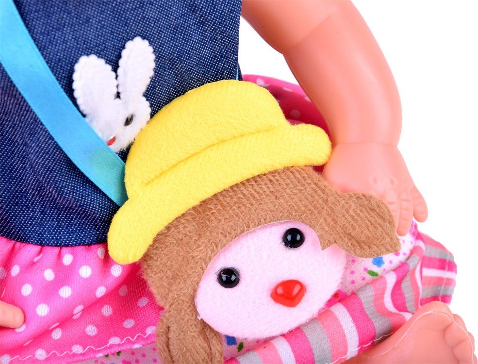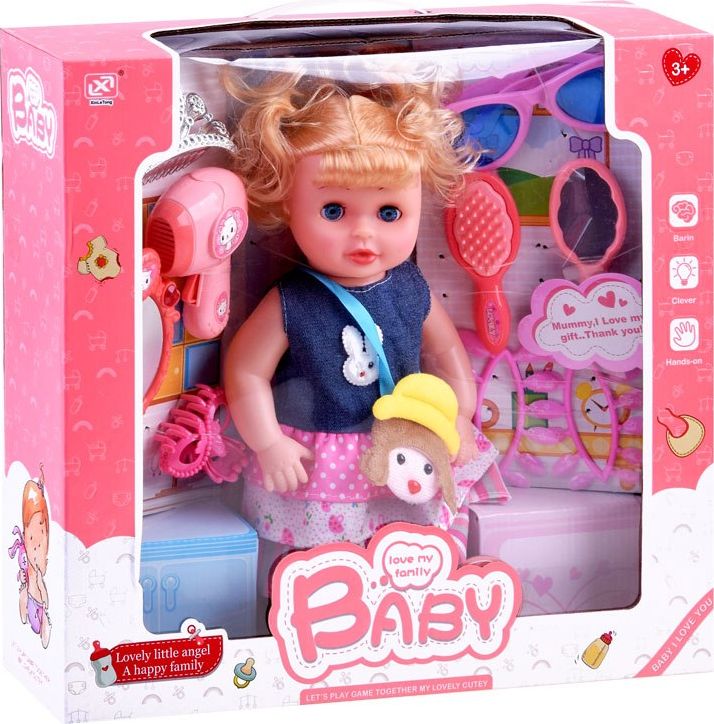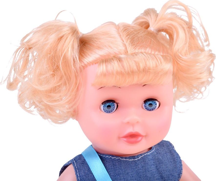 Urocza lalka z mnóstwem akcesoriów z pewnością przypadnie do gustu każdej małej strojnisi. Lalka ma długie, kręcone włosy, które można czesać oraz wesołą minkę. Kolorowe ubranko uzupełnia śliczna torebeczka. Z taką lalką można wybrać się na spacer, na zakupy czy na wycieczkę. Lalka w całości wykonana z tworzywa sztucznego. Niebieskie oczka lalki zamykają się, dzięki czemu można utulić je do snu. Lalka posiada ruchome kończyny ręce i nogi, głowa obraca się na boki.