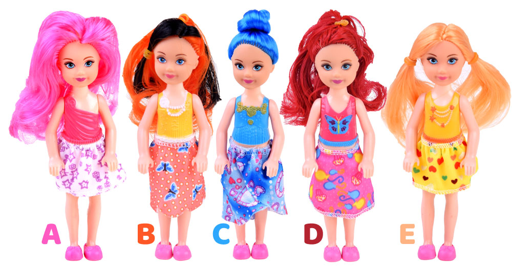 Mała laleczka do zabawy. Lalka ze wzrostem 14 cm będzie idealną towarzyszką każdej dziewczynki. Lalka dzięki swym niewielkim gabarytom może podróżować z dziewczynką do przedszkola, lekarza, na spacer zmieści się w każdym plecaku lub torebce. Laleczka w całości wykonana jest z plastiku, ma gumową głowę i długie kolorowe włosy.