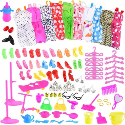 W skład zestawu wchodzi aż 10 letnich sukienek na ramiączkach, które umożliwiają szybkie zmienianie stylizacji. Dodatkowo, dzieci mają do dyspozycji 15 par obuwia w różnych stylach, w tym szpilki, sandały, baletki oraz buty na obcasie. Taki szeroki wybór pozwala na tworzenie unikalnych zestawów, które z pewnością zachwycą każdą małą fashionistkę.