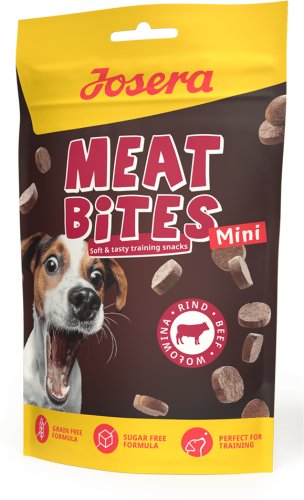 Delikatny smak w każdym kęsie! MeatBitesMinizwołowiną to perfekcyjna przekąska treningowa stworzona specjalnie dla małych psów. Zawierają aż 90 % mięsa, co zapewnia im wyjątkowy smak, a jednocześnie nie zawierają zbóż i cukru. Dzięki swojej miękkiej konsystencji i małym rozmiarom, idealnie pasują do małych pyszczków, a także są łatwe do porcjowania.