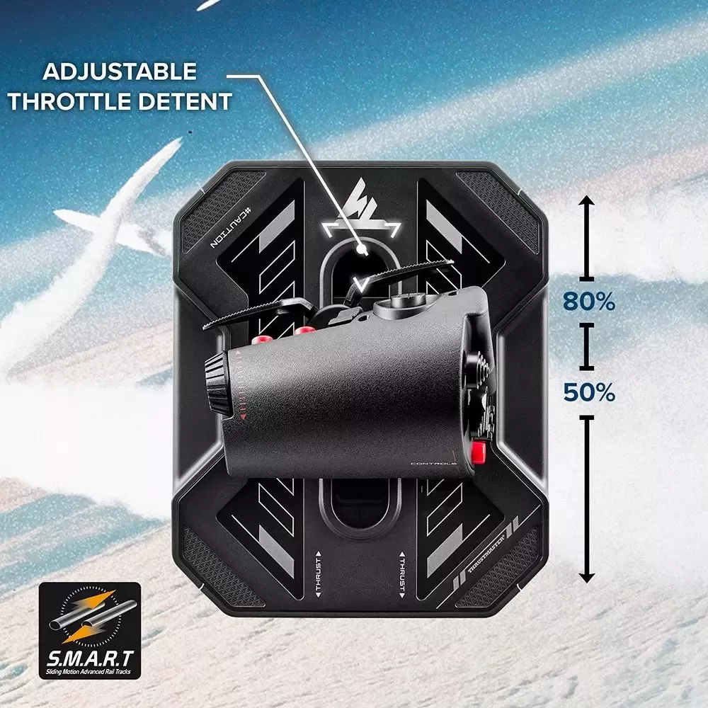 Doceń 80-milimetrowy zakres ruchu z zaawansowaną technologią S.M.A.R.T. (Sliding Motion Advanced Rail Tracks), zapewniającą płynny, precyzyjny i wygodny przesuw dla optymalnego sterowania ciągiem silników. Cztery dostępne położenia zapadki (brak, 50%, dopalacz na 80%, podwójna zapadka) pozwalają ją skonfigurować zgodnie z rodzajem pilotowanego samolotu.