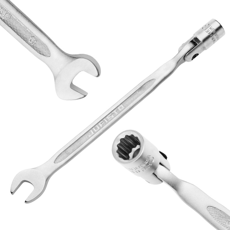 Zakres pracy przeguba wynoszący 180° zwiększa elastyczność klucza, umożliwiając dotarcie do najtrudniej dostępnych miejsc. To sprawia, że klucz jest niezwykle funkcjonalny i dostosowany do różnorodnych zadań.