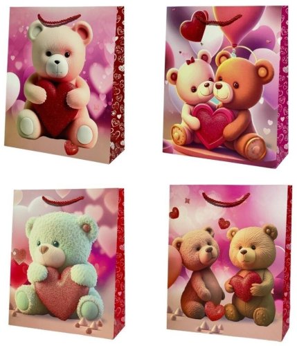 Torebka prezentowa dziecięca L Miś z sercem mix to znakomity wybór dla tych, którzy pragną nadać swoim podarunkom niepowtarzalny charakter. Dzięki atrakcyjnym wzorom, ta torebka stanie się nie tylko opakowaniem, ale również częścią radości związanej z wręczaniem prezentów.