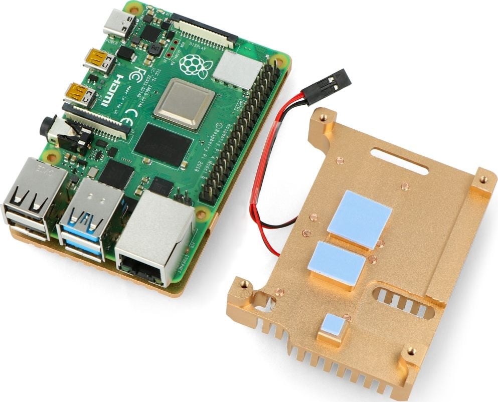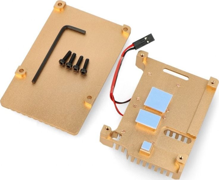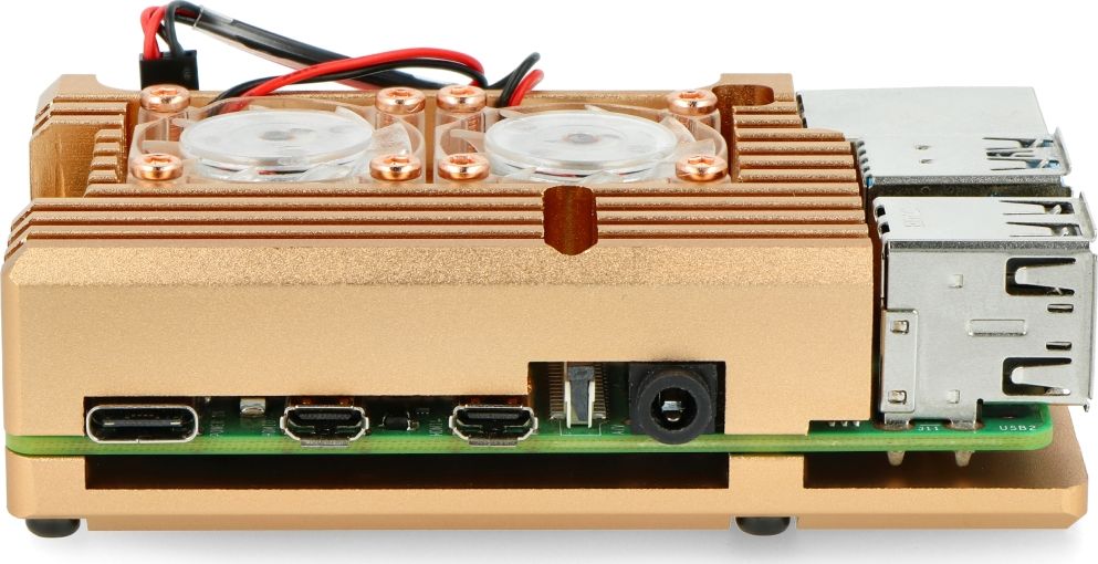 Obudowa do minikomputera Raspberry Pi 4B wykonana z metalu w kolorze złotym. Zestaw obejmuje śrubki montażowe, taśmy termoprzewodzące, 2 wentylatorki, podstawę obudowy z otworami montażowymi i pokrywę górną. Obudowa ma otwory pod złącza audio jack 3,5 mm, HDMI, USB, złącze Ethernet oraz na slot kart pamięci microSD, a także otwór na bezpośredni dostęp do GPIO. Górna pokrywa jest mocowana w prosty sposób za pomocą śrubek. Pełni rolę radiatora - dzięki taśmom termoprzewodzącym jest w stanie jeszcze szybciej odprowadzać ciepło z minikomputera. Otwory wentylacyjne umożliwiają naturalne chłodzenie elektroniki Raspberry Pi 4B, a ponadto górna obudowa posiada miejsce na instalację dwóch małych wentylatorów od górnej strony.