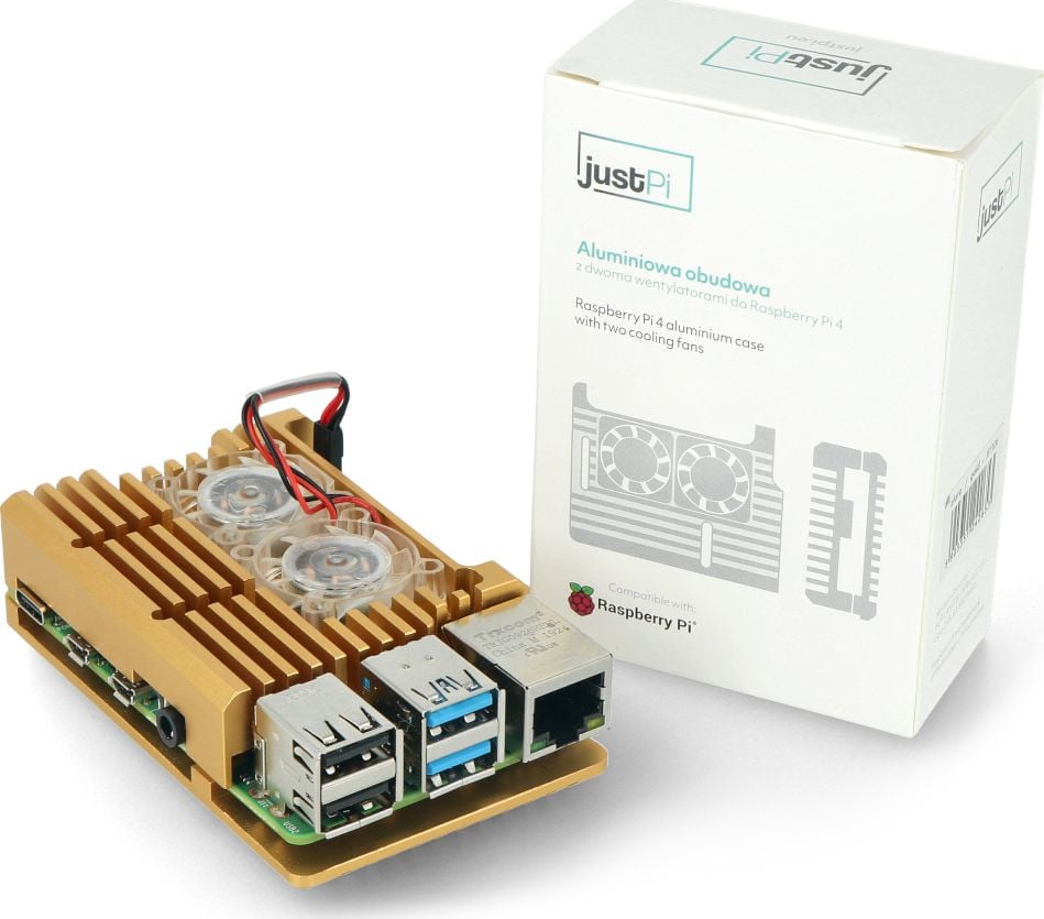 Opisywana obudowa do Raspberry Pi 4B z wentylatorami, dzięki efektywnemu systemowi chłodzenia, ogranicza ryzyko przegrzania minikomputera praktycznie do zera. Jest to szczególnie ważne w przypadku intensywnego użytkowania popularnej maliny przez dłuższy czas. Obudowa justPi do Raspberry Pi 4B wykonana z aluminium z dwoma wentylatorami w kolorze złotym skutecznie zabezpiecza urządzenia przed uszkodzeniami mechanicznymi. Jej konstrukcja została zaprojektowana w taki sposób, aby zapewnić komfortowe użytkowanie z podłączonymi akcesoriami lub innymi urządzeniami.