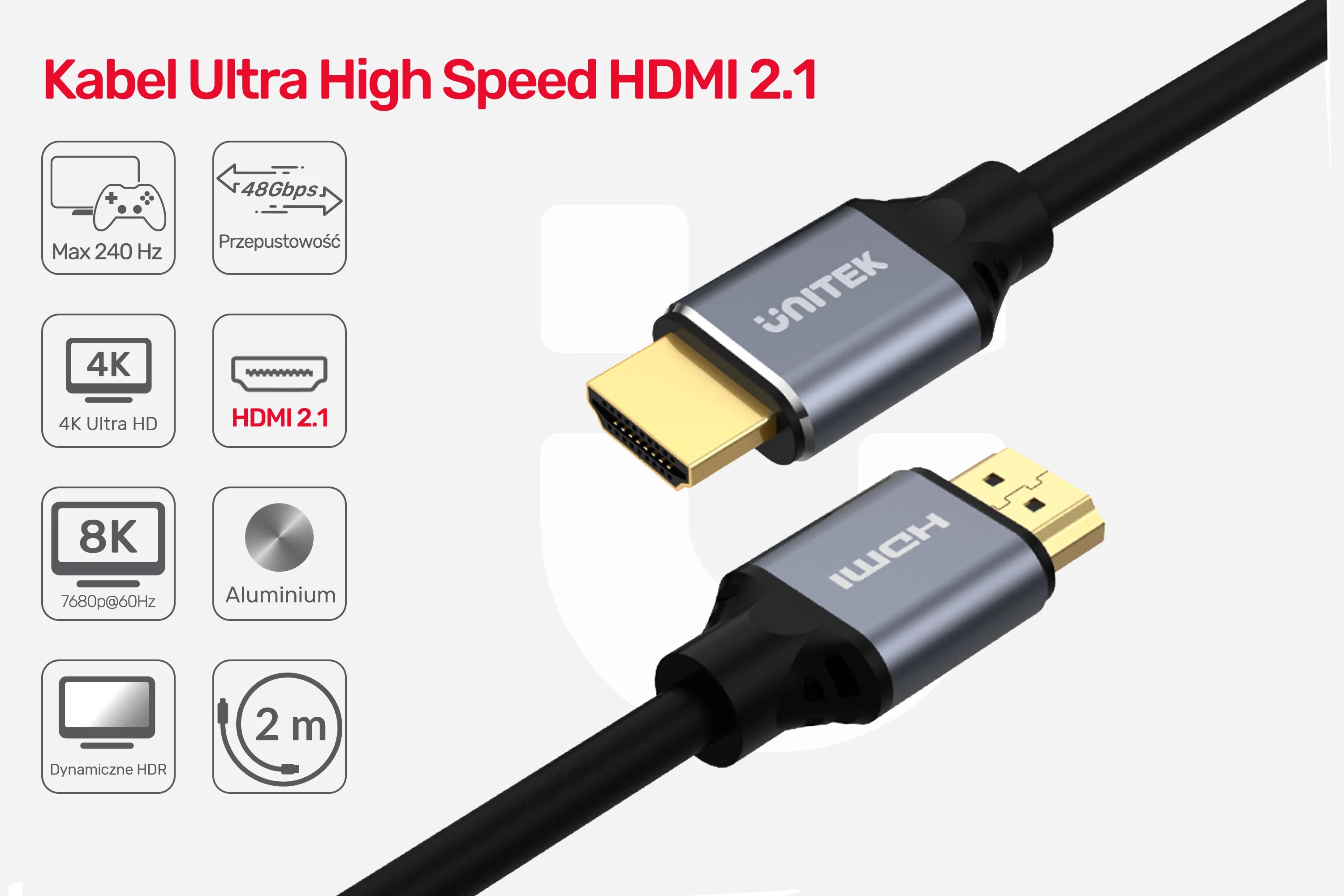 Ultra High Speed HDMI to standard przewodów audio-video o najwyższej przepustowości TMDS spośród obecnie dostępnych na rynku. Obsługuje wersję HDMI 2.1 i transfer danych z prędkością do 48 Gbit na sekundę. Tak ogromna przepustowość zapewnia krystalicznie ostry obraz o rozdzielczości 8K/60Hz oraz 4K/120Hz – to jakość i częstotliwość odświeżania klatek na sekundę, która zadowoli nawet najbardziej wybrednych graczy i znawców kina. W przyszłości ten przewód obsłuży także tak wysokie rozdzielczości jak 10K i 12K. Dzięki wykorzystaniu dynamicznego HDR obraz jest bardziej zbliżony do tego, co widzi ludzkie oko w rzeczywistości.