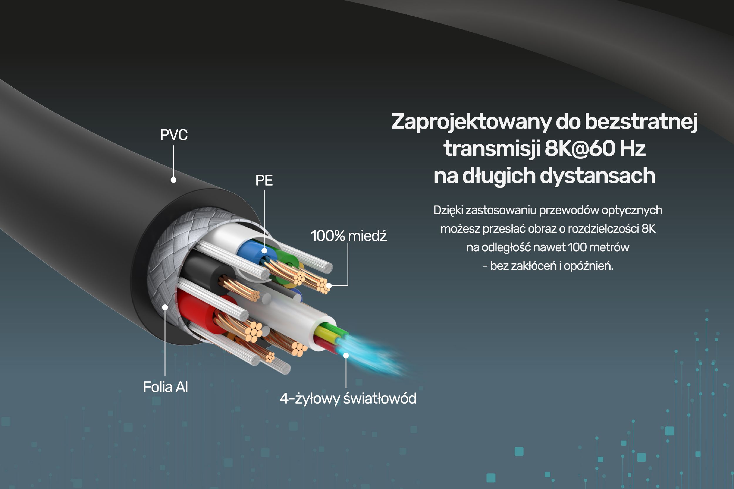 Najwyższe parametry obrazu i dźwięku wynikają wprost z zastosowania wysokiej jakości 4-żyłowego światłowodu jako wiązki przewodzącej. Wtyki wykonano z bardzo trwałego stopu cynku. Technologia światłowodowa to nie tylko jakość obrazu, ale i wygoda zastosowania w instalacjach. Przewód jest bardzo cienki i lekki, bo jego grubość to zaledwie 4,8 mm. Łatwo się układa, jest giętki, a jednocześnie wyjątkowo wytrzymały, co jest ważne w zastosowaniach profesjonalnych. Kabel jest jednokierunkowy, ale wtyki są wyraźnie oznaczone, więc nie sposób się pomylić. Fabrycznie przewód jest nawinięty na bęben, co jest dużym ułatwieniem dla instalatorów.