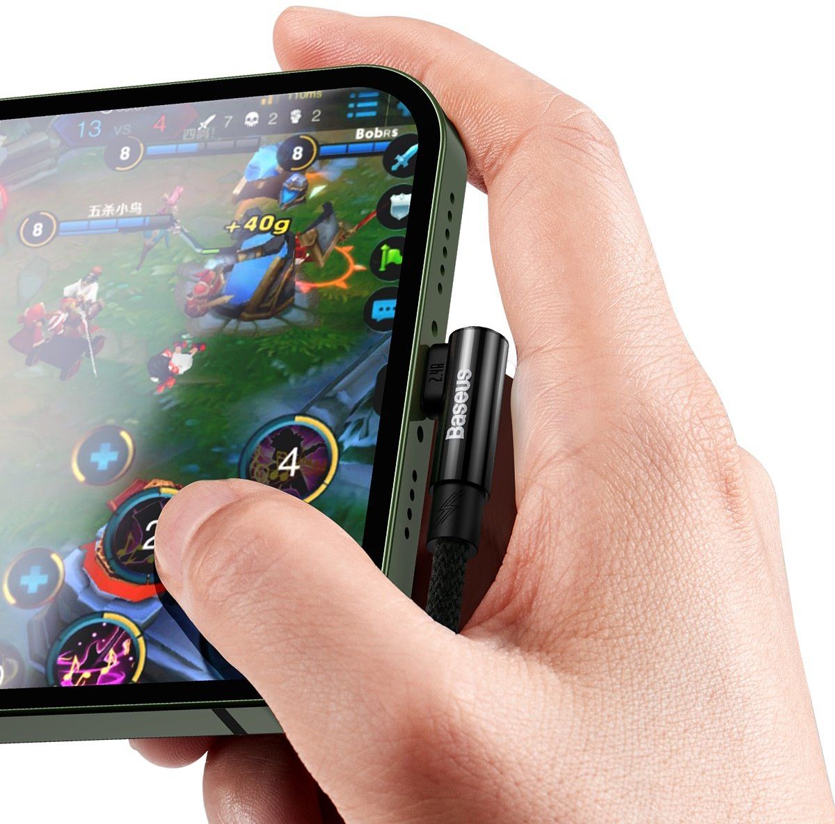 Boczny wtyk – Zmniejsza niebezpieczeństwo uszkodzenia kabla i zwiększa wygodę jego użytkowania. Nie utrudnia grania w ulubione w gry. Szczególnie te, które wymagają trzymania telefonu w poziomie. Przewód został wykonany z wysokiej jakości TPE i umieszczony w mocnym oplocie z nylonu i żyłki wędkarskiej. Design kabla oraz materiały, z których powstał, ograniczają plątanie się akcesorium.