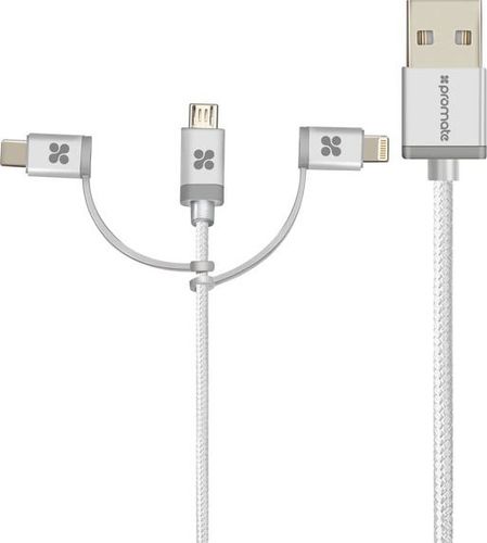 Kabel USB Promate USB-A - USB-C + Lightning 1.2 m Srebrny (AISUNLNKTRIOSV)