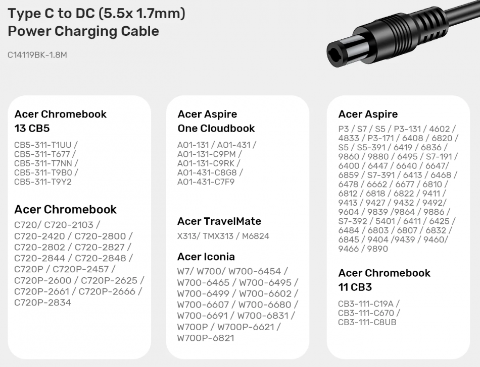 Kabel zasilający do laptopów Acer Unitek, 65W USB-C - DC5,5mm (C14119BK-1.8M)