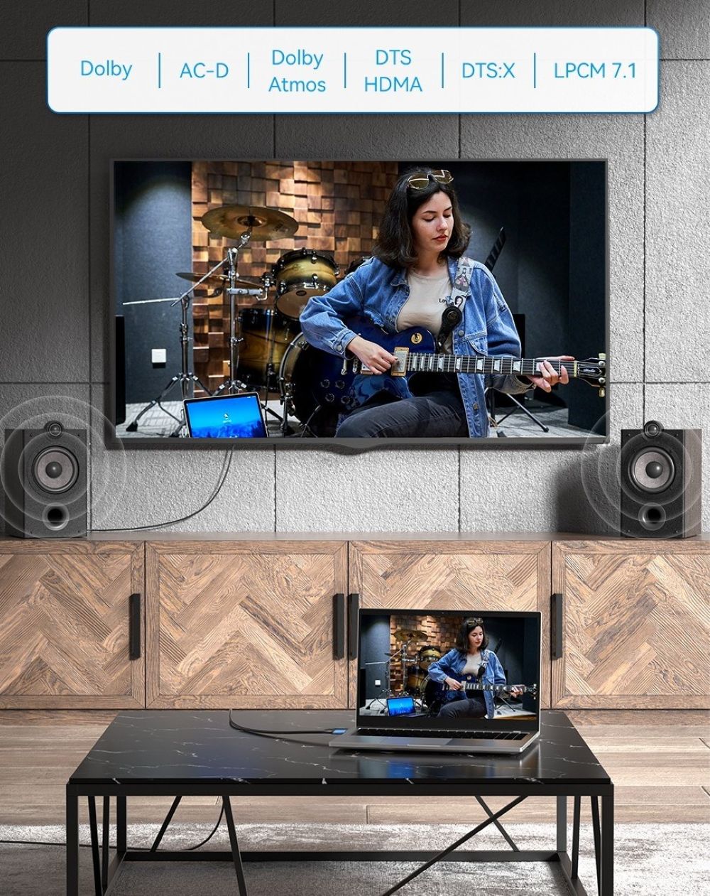 Zintegrowana obsługa eARC pozwala na przesyłanie nieskompresowanego dźwięku przestrzennego w formatach Dolby Atmos, DTS:X, LPCM 7.1 i innych. Synchronizacja sygnału audio i wideo w ramach jednego połączenia eliminuje potrzebę stosowania dodatkowych kabli czy konwerterów. Obsługuje do 32 kanałów audio z częstotliwością próbkowania do 1536 kHz. To rozwiązanie dedykowane zestawom kina domowego oraz systemom transmisji na żywo.