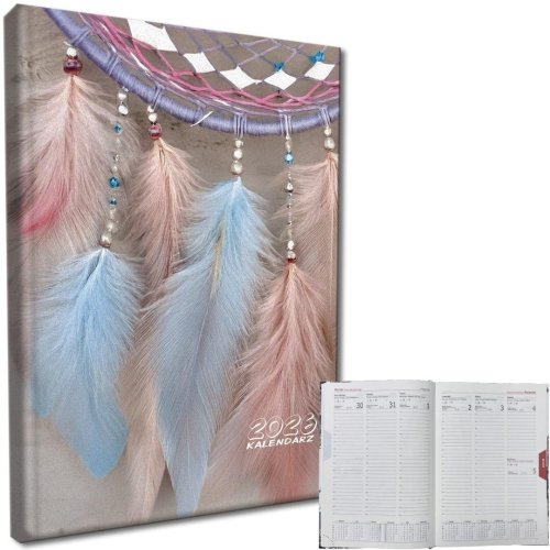 Kalendarz wyposażony jest w kolorowe registry, które ułatwiają nawigację po stronach, oraz kremową tasiemkę do zaznaczania stron, co dodaje mu elegancji i praktyczności. Dzięki tym dodatkom korzystanie z kalendarza staje się jeszcze bardziej komfortowe.