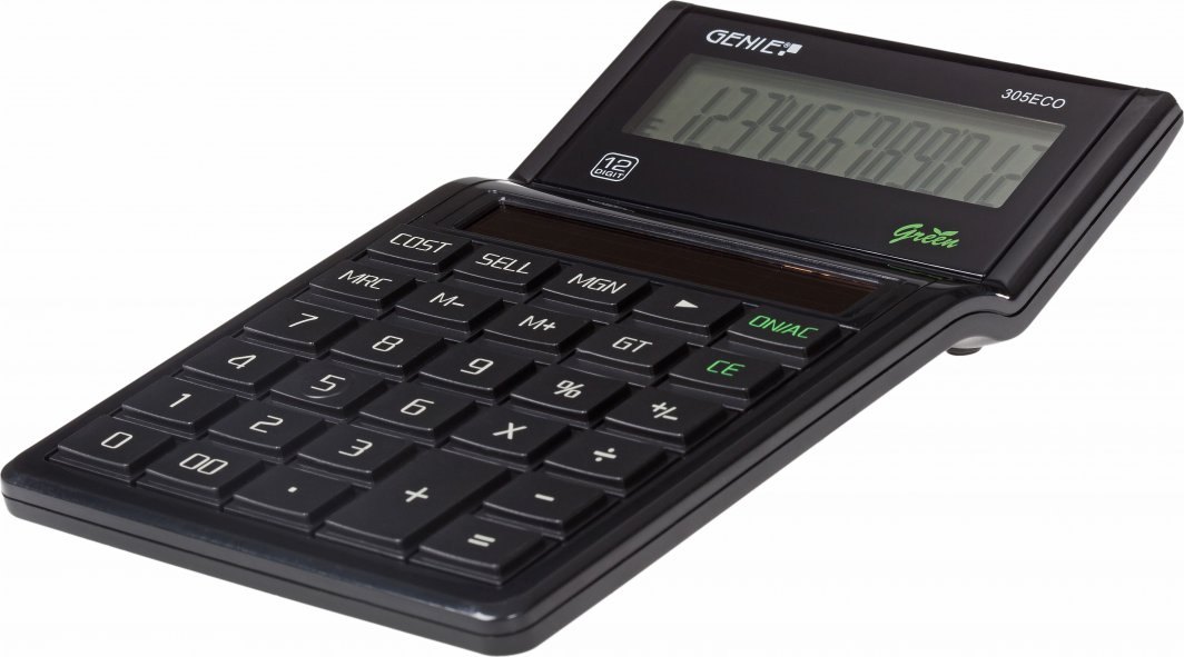Wyposażony w duży, nachylony wyświetlacz o 12 cyfrach, kalkulator zapewnia doskonałą widoczność, co ułatwia wykonywanie obliczeń. Niezależnie od tego, czy potrzebujesz go do prostych obliczeń, czy bardziej skomplikowanych zadań, Genie 305 ECO* sprosta Twoim oczekiwaniom.