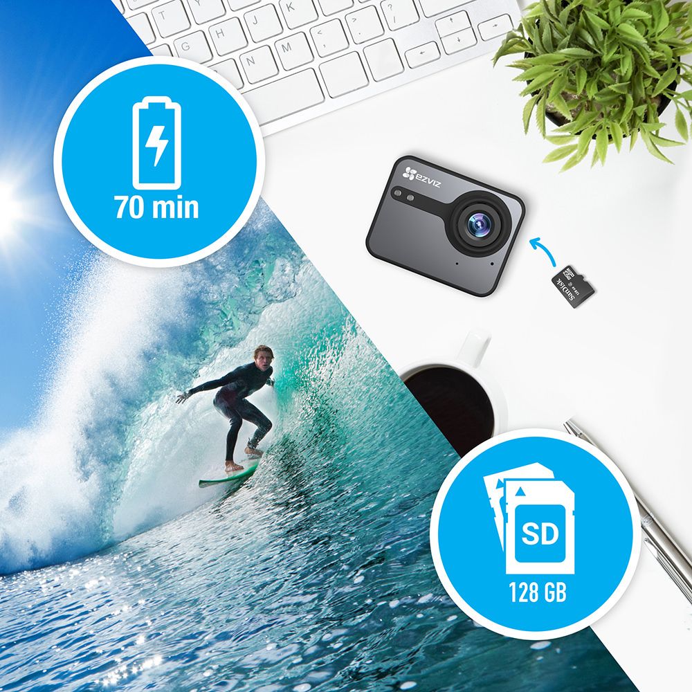 Wymienna bateria 1160mAh zapewnia do 70minut nieprzerwanej akcji, a wbudowany slot na karty microSD obsługuje karty do 128GB.