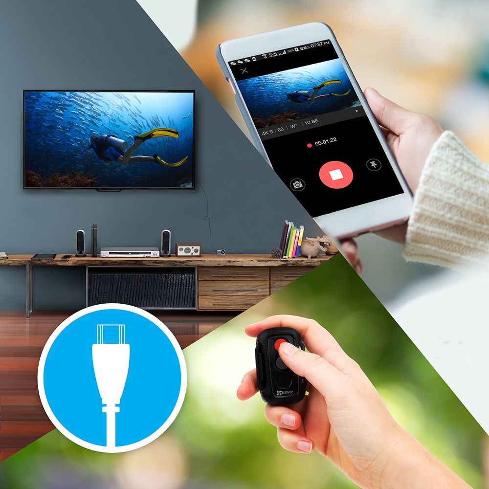 S1C obsługuje WIFI 2,4GHz do połączenia z Twoją aplikacją EZVIZ Sport i Bluetooth do połączeń ze zdalnym pilotem. Dzięki portowi mini HDMI możesz również łatwo podłączyć kamerę do telewizora lub monitora.