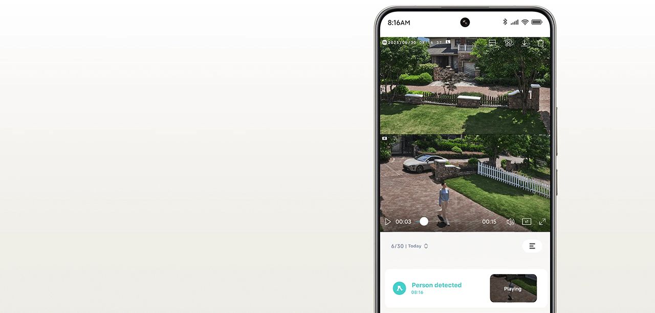 Dwa obiektywy wspierane technologią AI natychmiast reagują na ruch w polu widzenia, uruchamiając nagrania oraz wysyłając powiadomienia, aby Twój dom pozostawał bezpieczny przez cały czas.