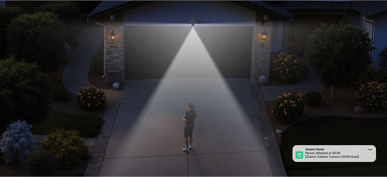 Xiaomi CW100 Dual to zewnętrzna kamera 2K HD z dwoma obiektywami, inteligentnym wykrywaniem AI oraz alarmem świetlno-dźwiękowym, zapewniająca skuteczny nadzór i ochronę domu.