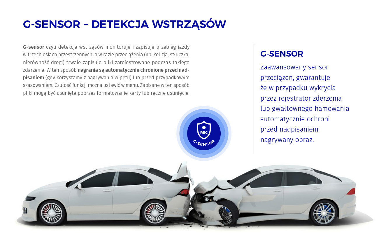 Czujnik wstrząsów zainstalowany na pokładzie kamery samochodowej wykrywa przeciążenia, które następują w wyniku gwałtownego hamowania, zderzenia, czy nierówności na drodze. Wtedy urządzenie rozpoczyna nagrywanie, zapisuje pliki w osobnym miejscu oraz zabezpiecza je przed usunięciem. Dzięki temu w razie wystąpienia kolizji drogowej z łatwością odnajdziesz film oraz wskażesz winnego. To sprawdzone rozwiązanie spotkało się z uznaniem wśród wielu odpowiedzialnych kierowców.