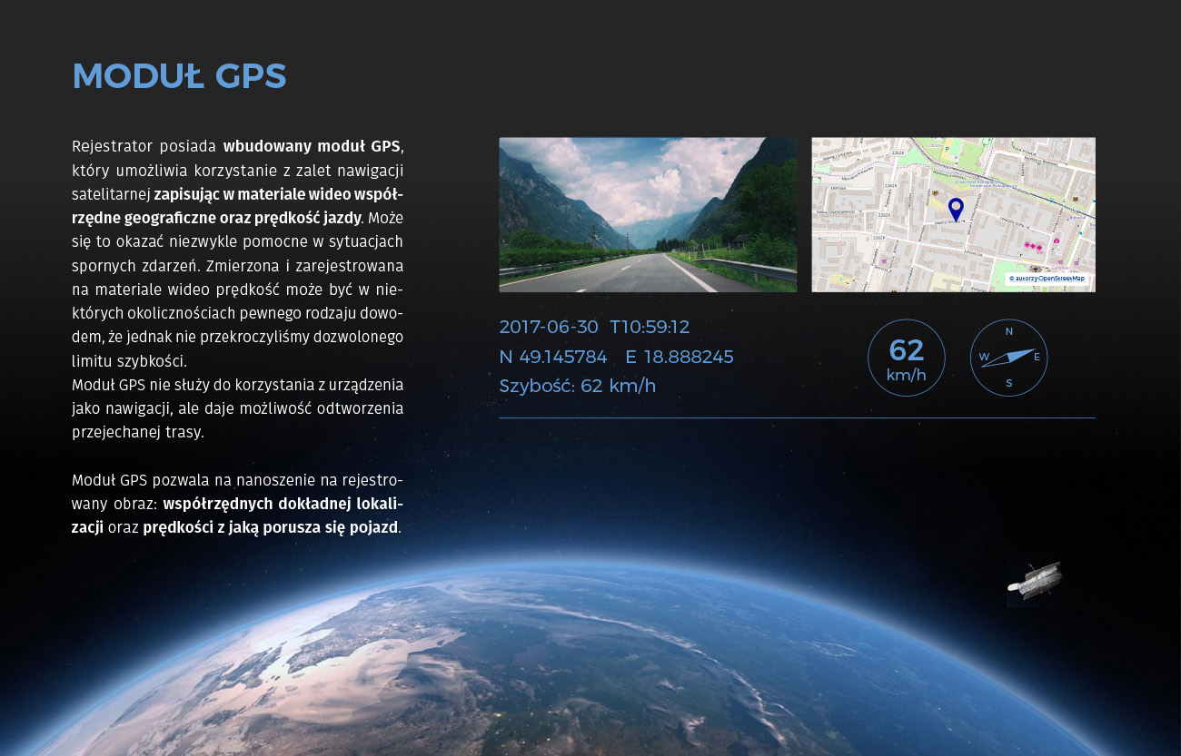 Odbiornik GPS zainstalowany na pokładzie kamery samochodowej pełni bardzo przydatne funkcje. Pozwala ustalić współrzędne geograficzne, na jakich aktualnie znajduje się pojazd, a także zmierzyć jego prędkość. Kolejnym atutem jest możliwość wizualizacji przejechanej trasy na mapie. To doskonała propozycja dla klientów, którzy zawsze stawiają na szerokie możliwości techniczne i poszukują praktycznych rozwiązań.