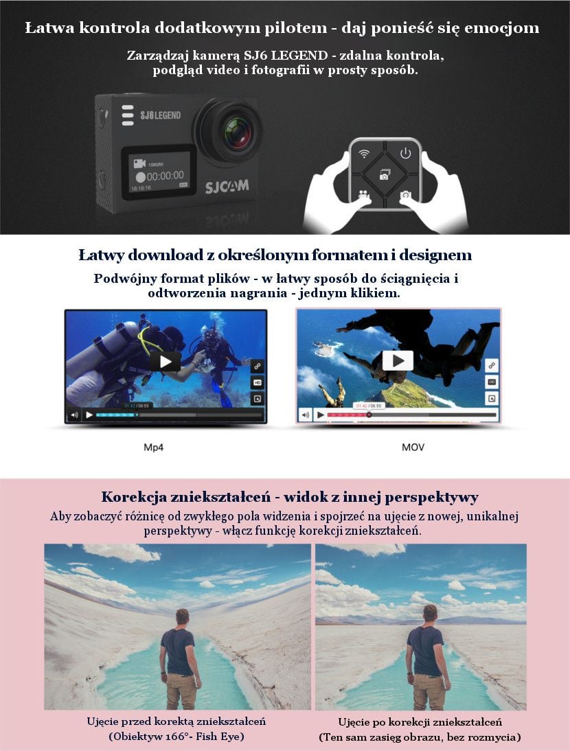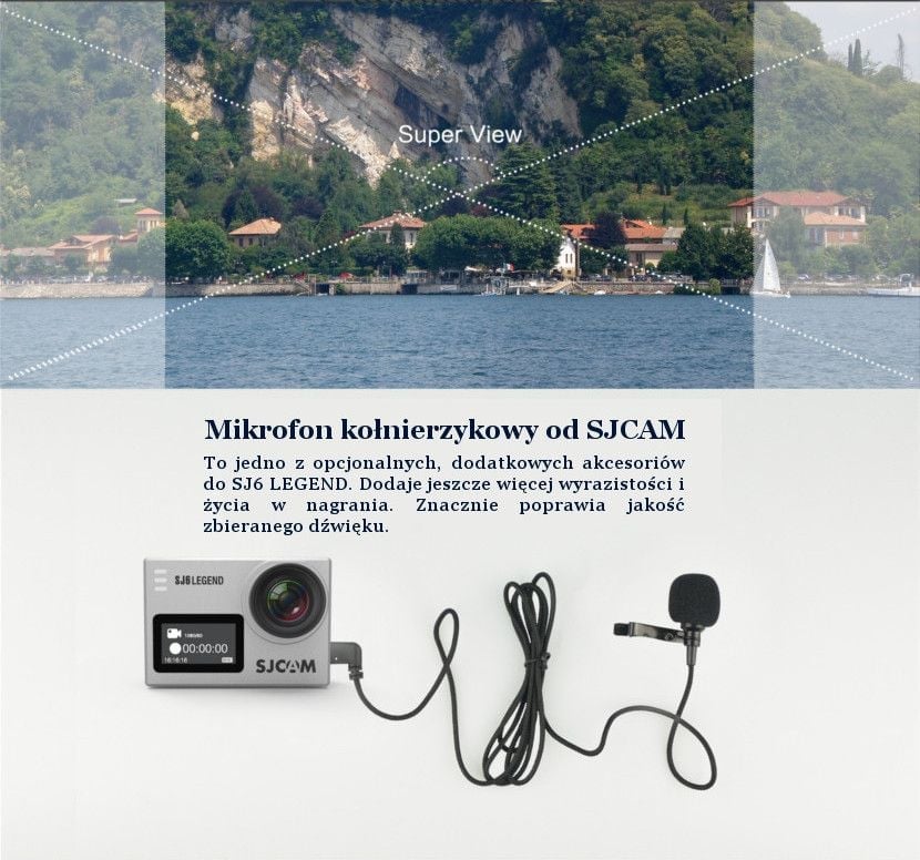 Kamera sportowa SJCAM SJ6 Legend jest odpowiedzią producenta na sugestie użytkowników, dzięki czemu w modelu zastosowano sporo innowacyjnych i wygodnych rozwiązań. Długo oczekiwaną funkcją jest możliwość podłączenia zewnętrznego mikrofonu. Na potrzeby modelu SJ6 Legend opracowano nawet specjalny, dedykowany mikrofon, jako akcesorium uzupełniające. Podobnie jest ze specjalnym pilotem do szybkiej nawigacji i zdalnego sterowania kamerą, w postaci wygodnego smartwatcha. Kamera pozwala na zapis obrazu w wysokiej rozdzielczości 4K przy 24fps. Wszystko dzięki modułom zastosowanym w modelu: chipsecie NTK96660 i sensorze Panasonic MN34120PA. Dodatkowo SJ6 Legend wyposażono w funkcję korekty zniekształceń. Co więcej, zwiększono również pojemność baterii do 1000 mAh. Dużym ułatwieniem korzystania z kamery jest zastosowanie po raz pierwszy podwójnego wyświetlacza. Dzięki temu mamy całkowity podgląd do zapisywanego materiału na żywo. Oprócz tego wyświetlacz główny, o przekątnej 2.0” jest dotykowy. Aby ułatwić zabawę z kamerą i dzielenie się wrażeniami – producent udostępnia równocześnie nową aplikację SJCAM APP, która kompatybilna jest nie tylko z modelem SJ6 Legend – ale również z poprzednimi seriami kamer SJCAM.