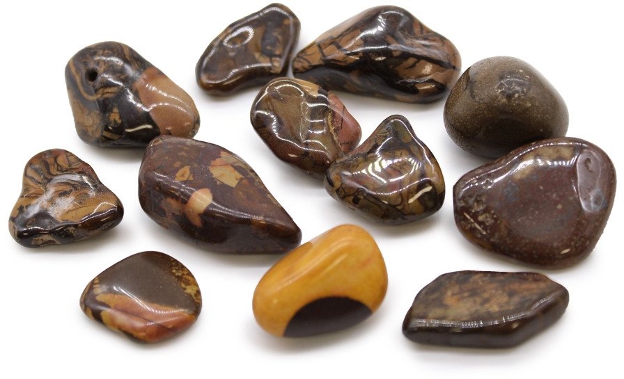 Kamień Afrykański Średni – Jaspis Nguni | 12 sztuk. Waga 190 g. Afryka to kontynent bardzo bogaty w surowce mineralne, dzięki czemu tylko tam znajdziemy tak wiele pięknych i unikalnych kamieni szlachetnych. O ich zadziwiającym i ekscytującym uroku decyduje ich niepowtarzalność kolorystyczna. Na etapie produkcji są one polerowane dzięki czemu mogą być powszechnie używane do celów dekoracyjnych lub metafizycznych. Powstają poprzez umieszczenie szorstkich kamieni w maszynie zwanej bębnem, która wykorzystuje szereg materiałów ściernych do polerowania i wygładzania kamieni, aż staną się okrągłe i błyszczące. Rezultatem jest kolekcja kamieni, które idealnie nadają się do wykorzystania w rzemiośle, tworzeniu biżuterii lub jako elementy dekoracyjne.