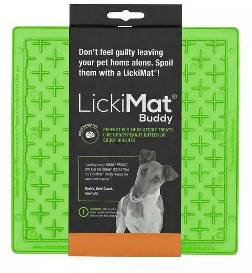LickiMat Buddy posiada labiryntowe kieszenie i jest idealna do serwowania takich przekąsek jak specjalne dla psów masło orzechowe czy rozmoczone ciasteczka.