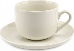 Duża filiżanka ze spodkiem. Uniwersalna forma i kremowa tonacja barwna.