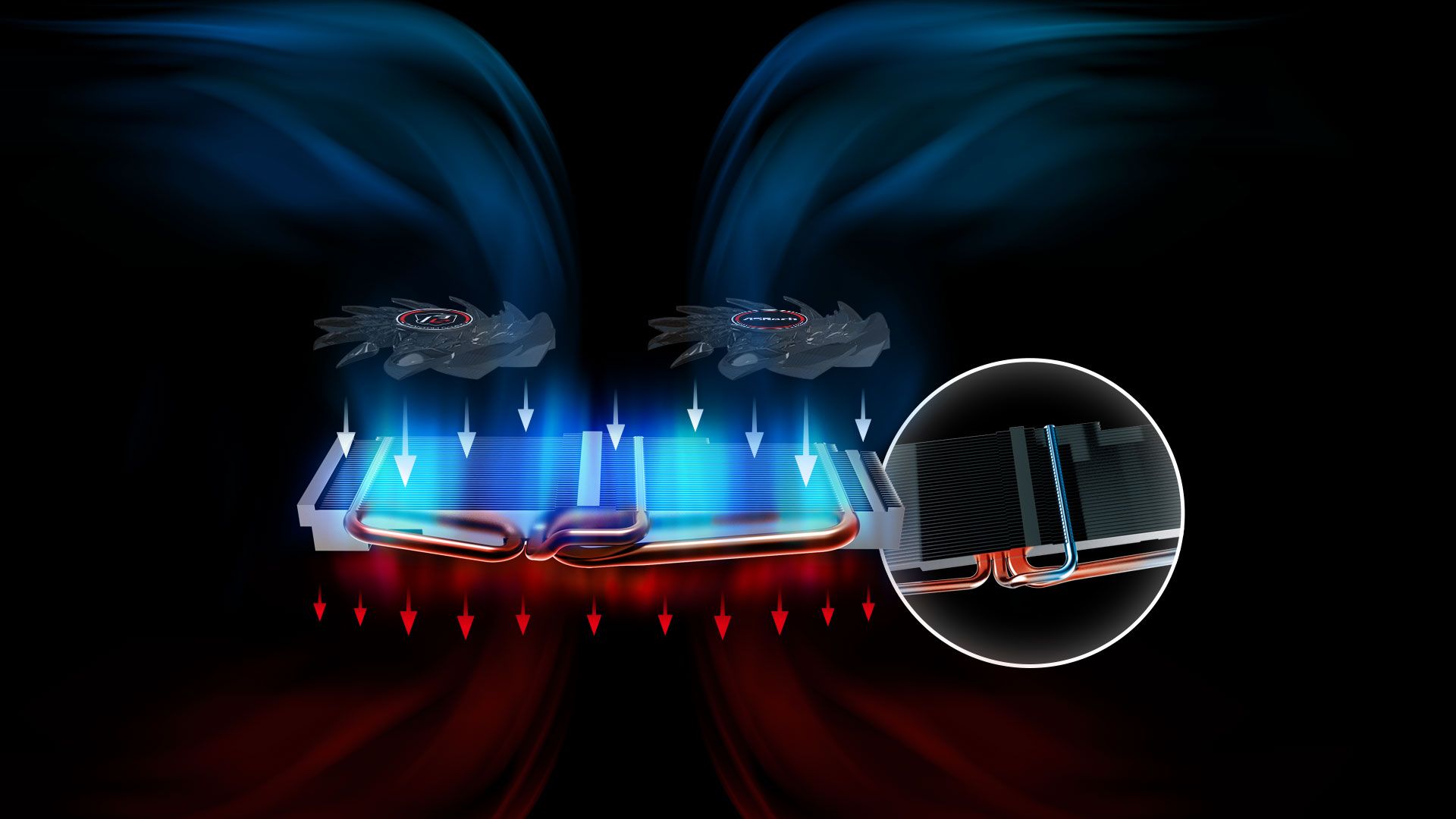 Pod stylową i opływową konstrukcją z dwoma wentylatorami znajduje się anodyzowany i ogromny aluminiowy radiator, rurka cieplna wraz z wystarczającą ilością żeber, które odbierają ciepło z GPU, skutecznie poprawiają rozpraszanie ciepła i znacznie zwiększają ogólną wydajność.