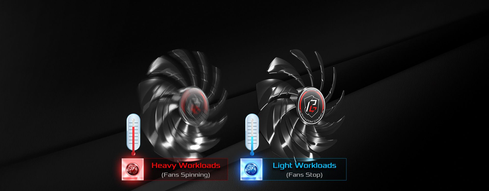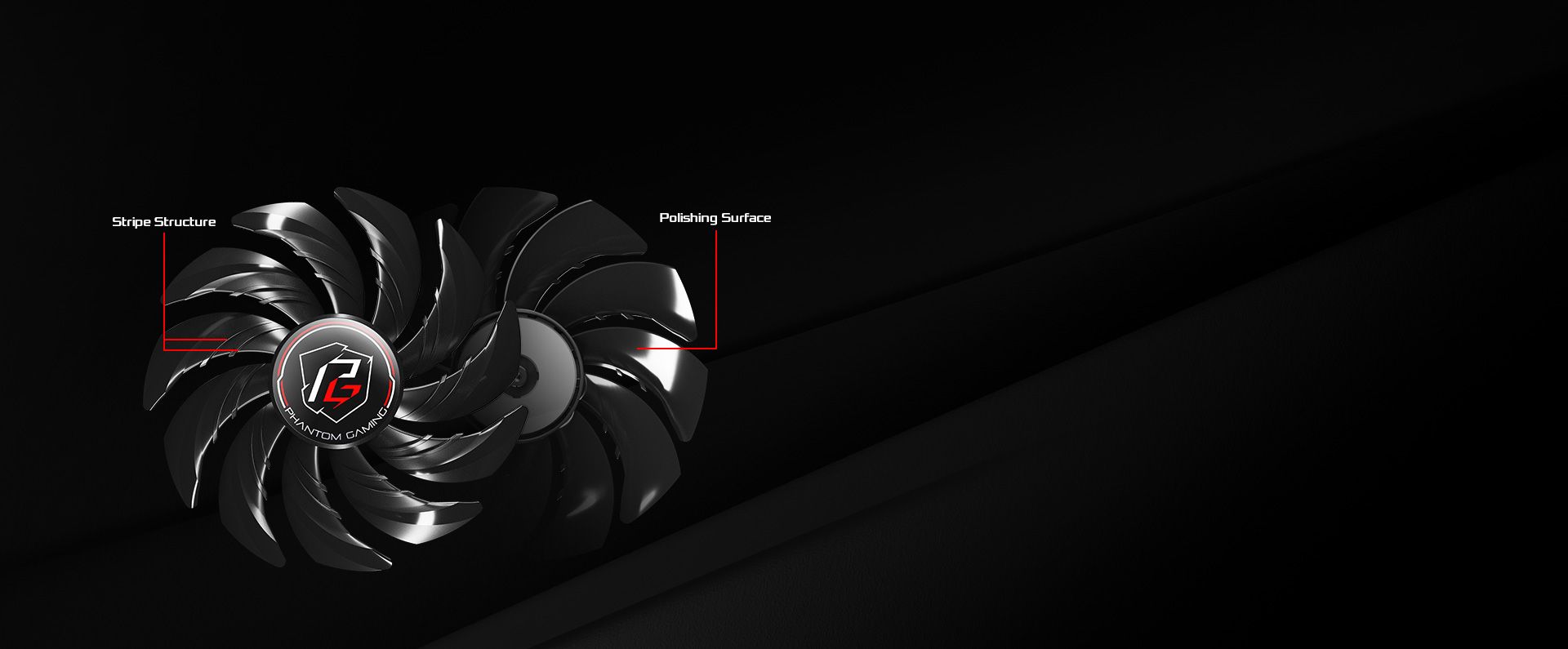 Niestandardowy paskowy wentylator osiowy ASRock zapewnia ulepszony przepływ powietrza, aby zoptymalizować chłodzenie nie tylko od struktury pasków na każdej łopatce wentylatora, ale także od powierzchni polerującej na spodzie.