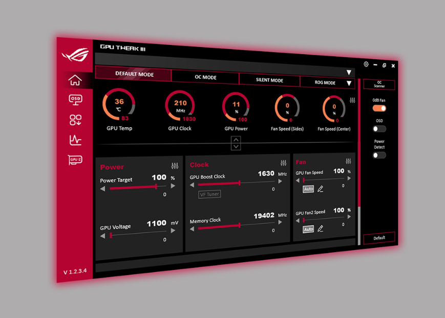 ASUS GPU Tweak III jest bardziej intuicyjny i bogaty w funkcje niż kiedykolwiek wcześniej. Ulepszony interfejs zapewnia większą dostępność poprzez integrację podstawowych funkcji w scentralizowanym panelu kontrolnym, a nasz tuner napięcia i częstotliwości został przebudowany, aby jeszcze bardziej ułatwić podkręcanie. Dodatkowe udogodnienia, takie jak technologia wentylatorów 0dB, automatyczna zmiana profili, w pełni konfigurowalny wyświetlacz ekranowy i możliwości rejestrowania, zapewniają maksymalne wykorzystanie możliwości karty graficznej.