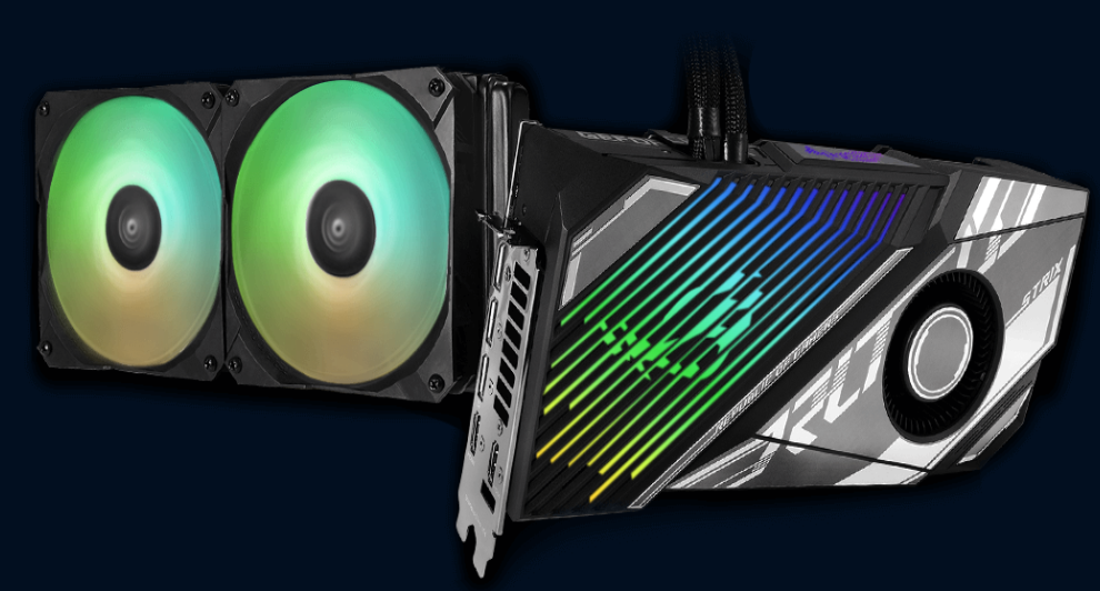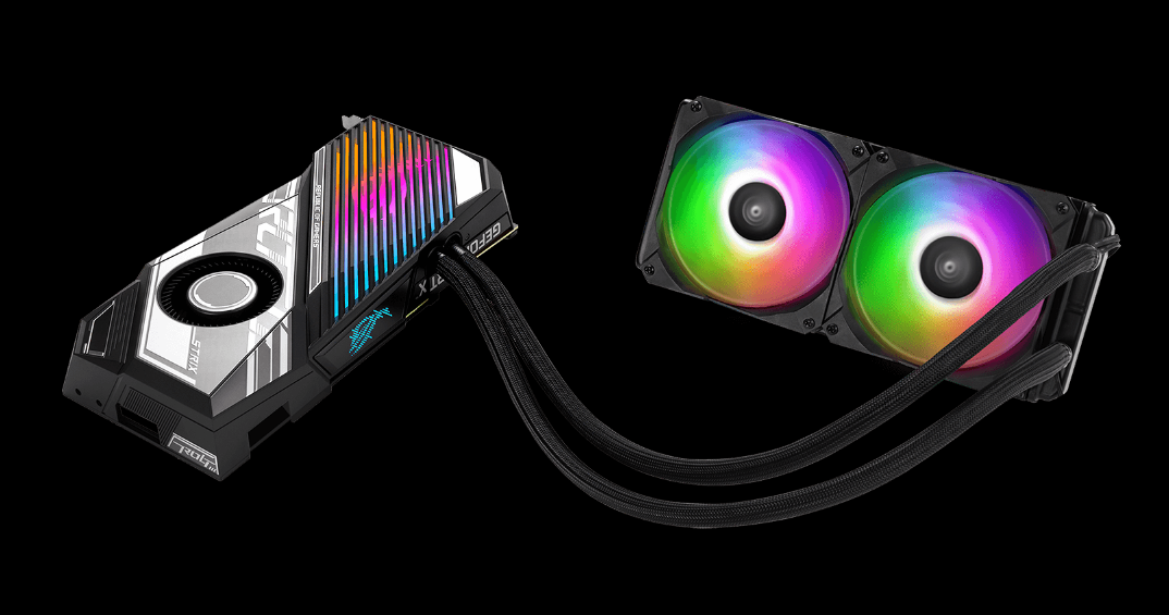 Specjalnie zaprojektowana płyta chłodząca rozciąga się nad układem graficznym i wbudowaną pamięcią GDDR6X, zapewniając pełne korzyści chłodzenia cieczą komponentom najbardziej odpowiedzialnym za surową wydajność. Ciepło wytwarzane przez elementy układu zasilania jest cicho odprowadzane przez wentylator z dmuchawą i niskoprofilowy radiator umieszczony pod osłoną. Chłodnica 240 mm jest chłodzona dwoma mocnymi wentylatorami ARGB 120 mm, zoptymalizowanymi pod kątem wysokiego przepływu powietrza i ciśnienia statycznego.