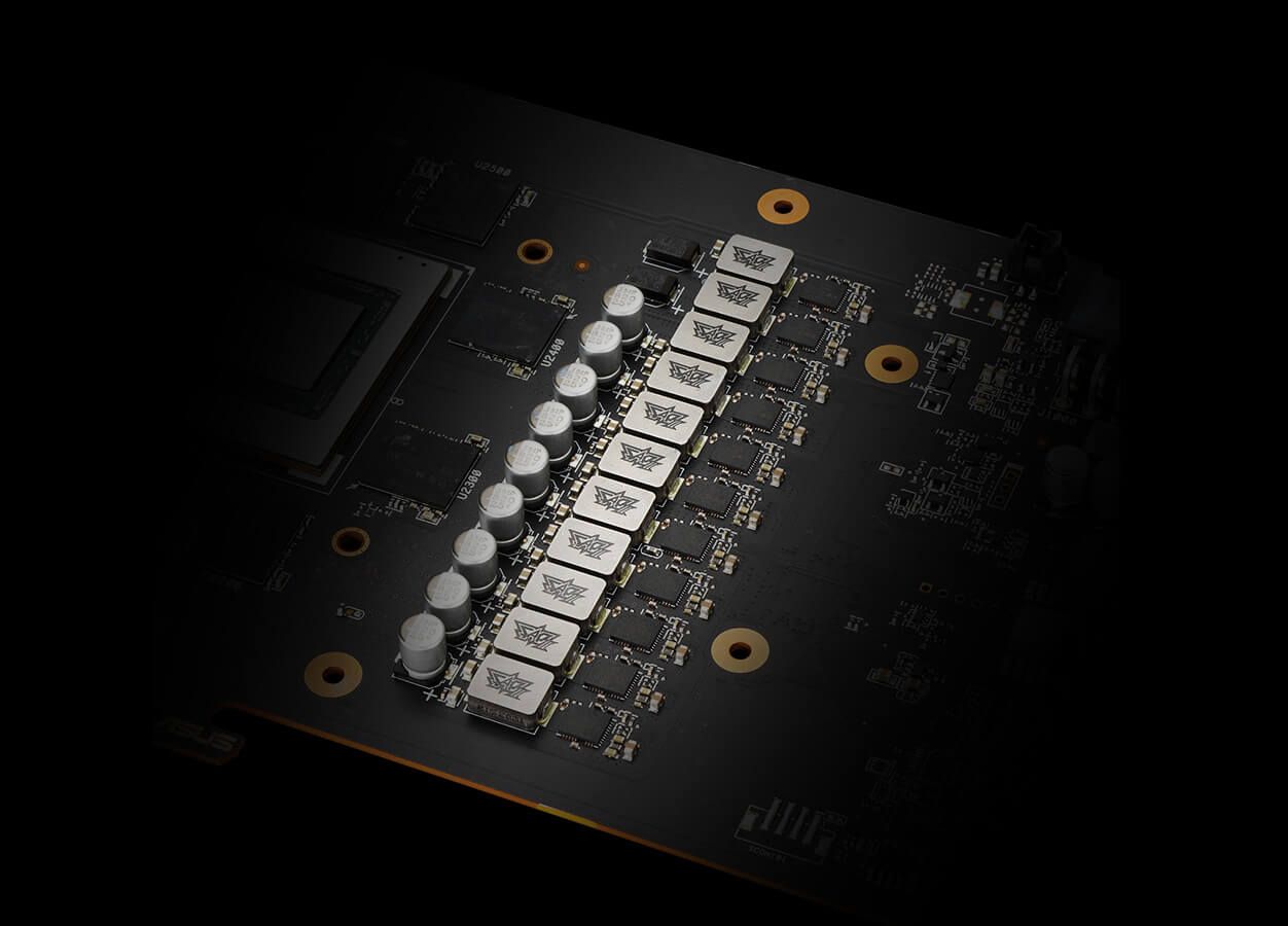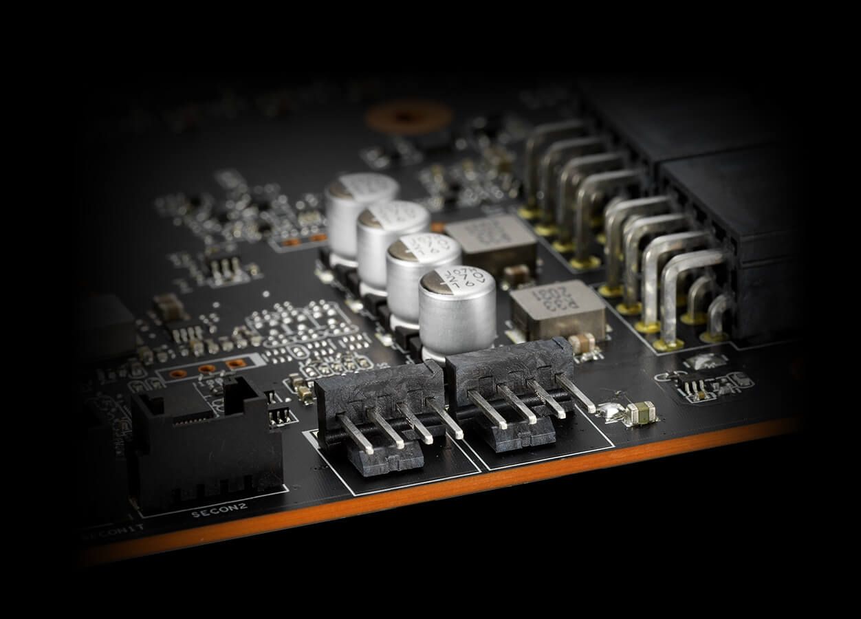 Kondensatory, dławiki i tranzystory MOSFET z najwyższej półki zostały dobrane tak, aby bez wysiłku dostarczać setki watów w ciągu milisekundy. Części Super Alloy Power II są lutowane do płytki drukowanej przy użyciu naszego zaawansowanego, zautomatyzowanego procesu produkcyjnego Auto-Extreme. Gładkie złącza z tyłu płytki drukowanej i eliminacja błędów ludzkich zapewniają, że każda karta graficzna spełnia nasze rygorystyczne specyfikacje.
