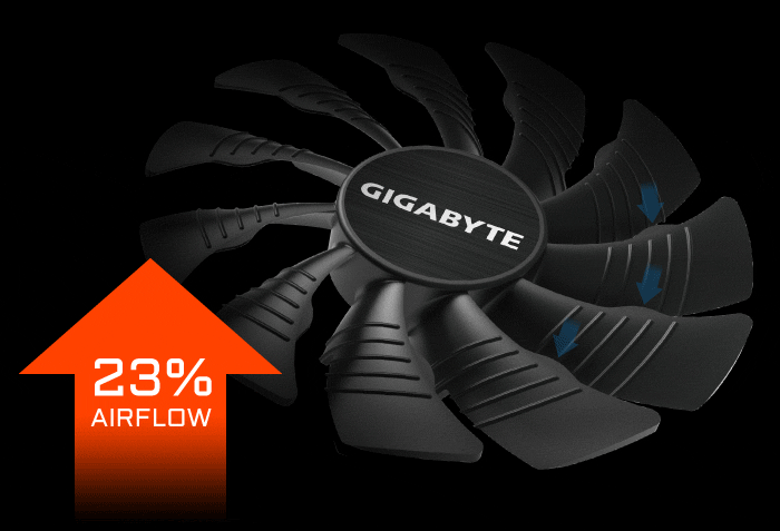 System chłodzenia WINDFORCE 3X wyposażony jest w unikalne wentylatory łopatkowe 3x80 mm, 3 kompozytowe miedziane rury cieplne, bezpośredni kontakt z rurką cieplną i aktywną funkcję wentylatora 3D, które razem zapewniają efektywną zdolność rozpraszania ciepła w celu uzyskania wyższej wydajności w niższych temperaturach.