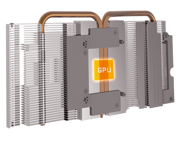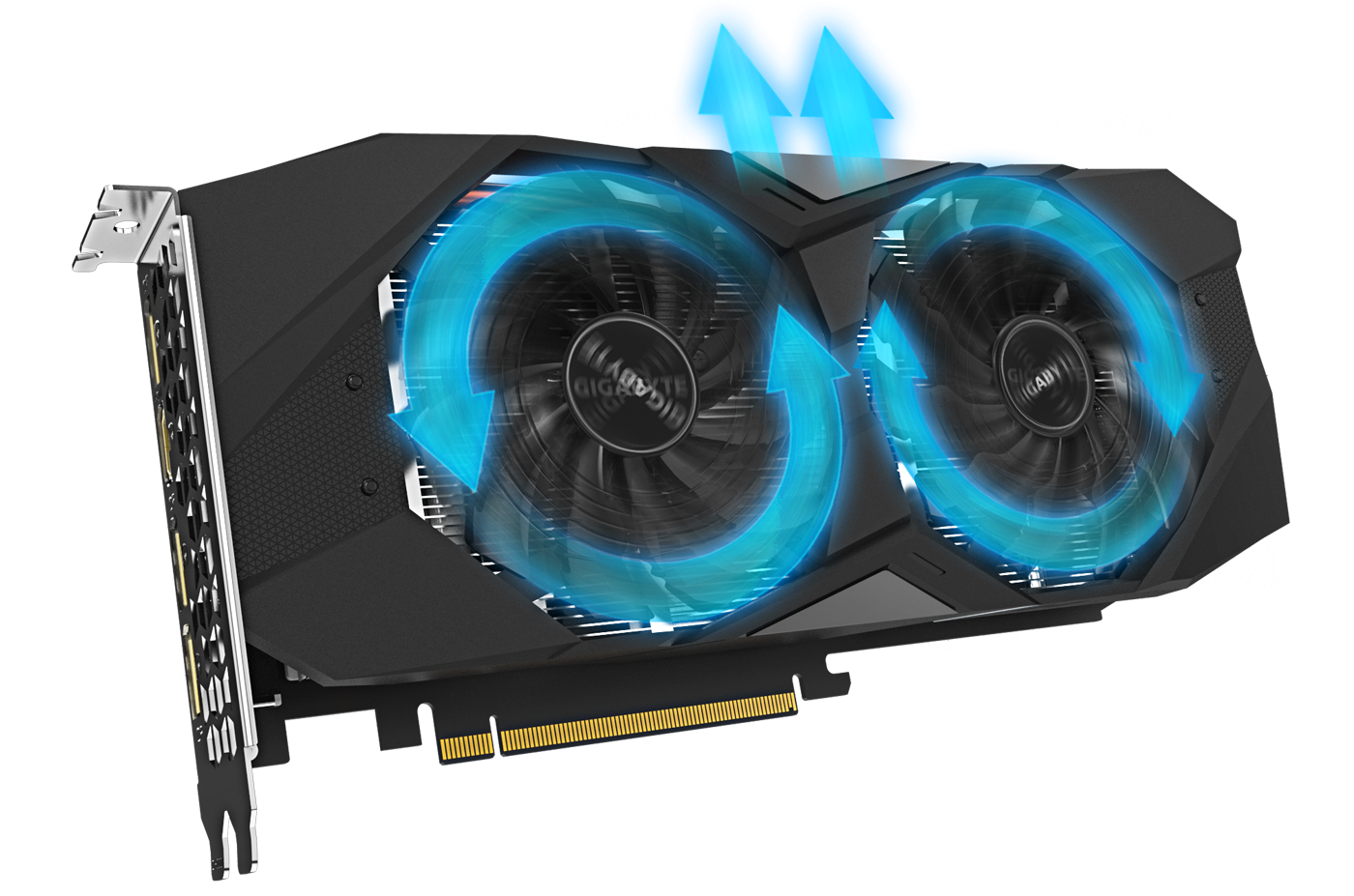 System chłodzenia WINDFORCE 2X posiada 2x unikalne wentylatory łopatkowe 100 mm, alternatywny wentylator wirujący, 2 kompozytowe miedziane rury cieplne z bezpośrednim dotykiem GPU i aktywny wentylator 3D, które razem zapewniają skuteczne odprowadzanie ciepła.