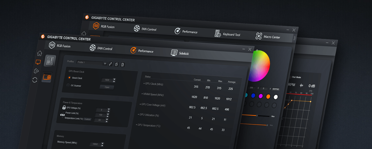 GIGABYTE Control CENTER (GCC) to ujednolicone oprogramowanie dla wszystkich obsługiwanych produktów GIGABYTE. Zapewnia intuicyjny interfejs, który pozwala użytkownikom regulować prędkość zegara, napięcie, tryb wentylatora i docelową moc w czasie rzeczywistym.