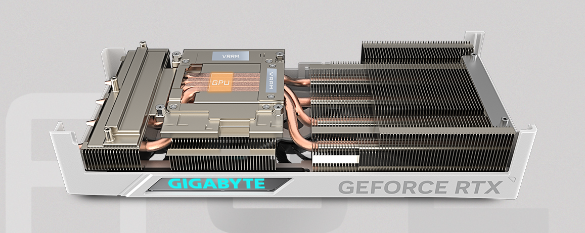 Duża miedziana płytka bezpośrednio styka się z procesorem graficznym w połączeniu z kompozytowymi rurkami cieplnymi, które szybko przekazują ciepło z procesora graficznego i pamięci VRAM do radiatora.