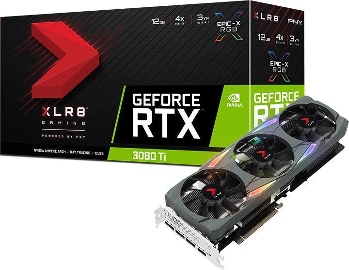 PNY VCG3080T12TFXMPB. Rodzina procesorów grafiki: NVIDIA, Procesor graficzny: GeForce RTX 3080 Ti, Taktowanie procesora: 1365 Mhz. Pamięć adaptera dedykowanej karty graficznej: 12 GB, Typ pamięci adaptera grafiki: GDDR6X, Magistrala pamięci: 384 bit. Maks. rozdzielczość: 7680 x 4320 px. Wersja DirectX: 12.0, Wersja OpenGL: 4.6. Typ interfejsu: PCI Express x16 4.0. Rodzaj chłodzenia: Aktywne, Liczba wentylatorów: 3 went.