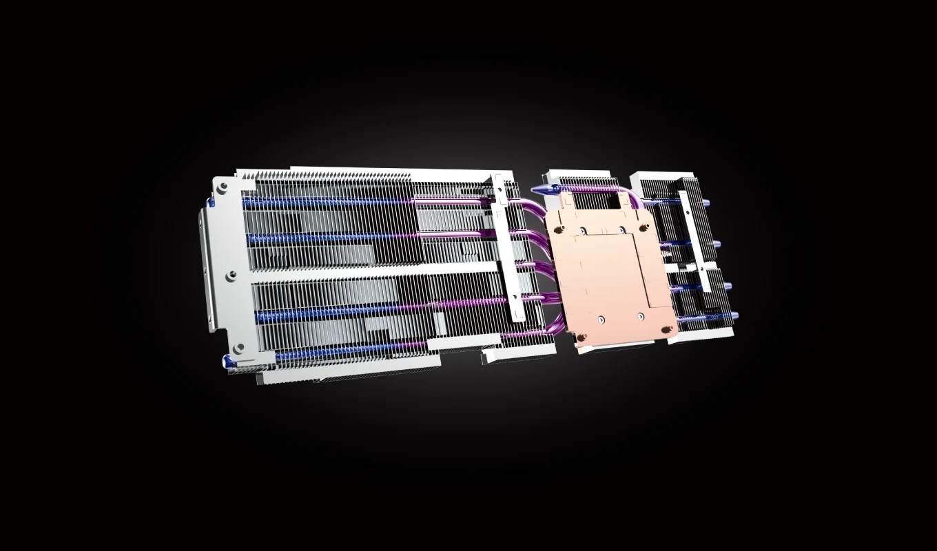 Zestaw 7 rurek cieplnych z miedzi niklowanej 6φ jest ustawiony blisko siebie nad płytką drukowaną, aby szybciej i skuteczniej przenosić ciepło z procesora graficznego i pamięci VRAM do układu chłodzącego.